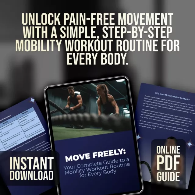 Feeling stiff, stuck, or limited in your daily movement? “Move Freely: Your Complete Guide to a Mobility Workout Routine for Every Body” is the go-to digital guide for anyone looking to move better, feel better, and live more actively—regardless of age or fitness level. Whether you’re new to fitness, returning from injury, or simply want to improve your performance and prevent discomfort, this mobility workout routine guide was made for you. Designed by movement experts and packed with easy-to-follow steps, this downloadable resource helps you build a sustainable routine to enhance flexibility, mobility, and whole-body wellness.