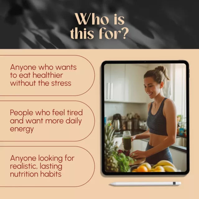 This is for anyone who wants to eat better without spending hours researching or cooking. It’s ideal for wellness beginners, busy professionals, students, parents, or anyone who wants to feel more confident about making nutritious meals that support real life—not just the perfect Instagram photo.