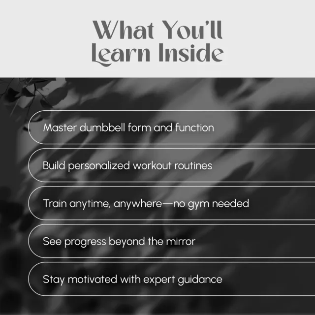 As someone who constantly travels for work, finding time and space for workouts can be challenging. This eBook has made it so much easier! With its focus on dumbbells (which are easy to pack), I now have access to versatile workouts wherever I go. Moreover, the guide isn't just about exercises; it also offers valuable advice on avoiding common mistakes and staying motivated—something that's really helped me stay consistent with my routine.