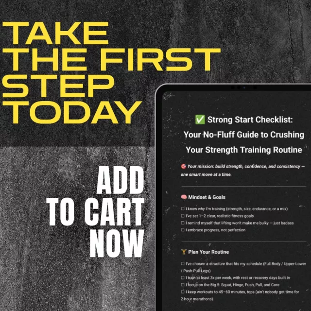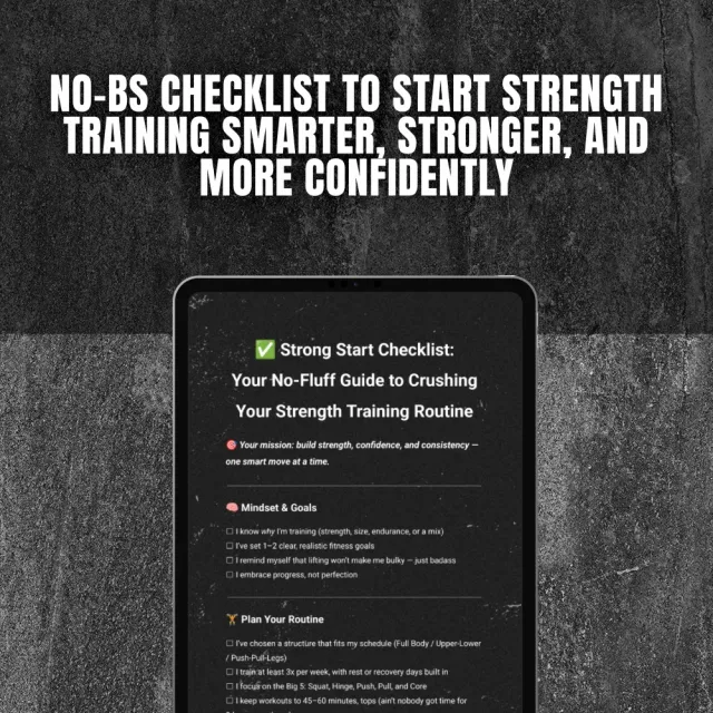 Ready to stop spinning your wheels and start lifting with confidence? Download the Strong Start Checklist: Your No-Fluff Guide to Crushing Your Strength Training Routine today and take the guesswork out of your workouts. This digital strength training routine checklist is the first step to building a stronger, more confident you — one rep at a time.
