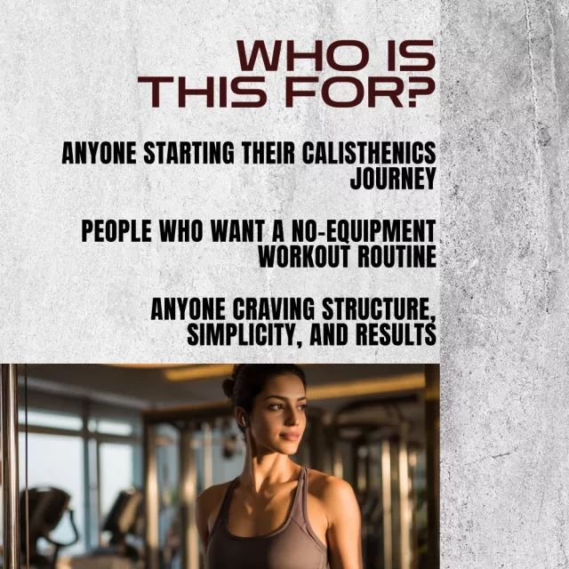 This guide is perfect for anyone who wants to start calisthenics, get fit at home, or create a consistent routine without depending on a gym. It’s ideal for beginners, busy schedules, or anyone who wants to build strength and discipline—one push-up at a time.